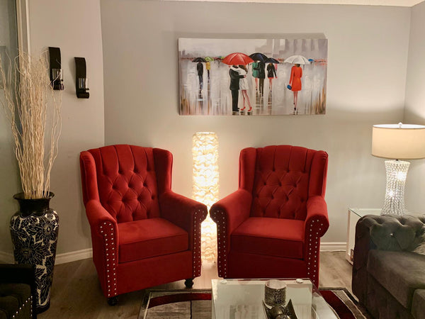 Canadian made accent chair with tufted wing back design. Available with diamond tufting or button tufting. Chrome studs are optional. Choose from various colours and fabrics.