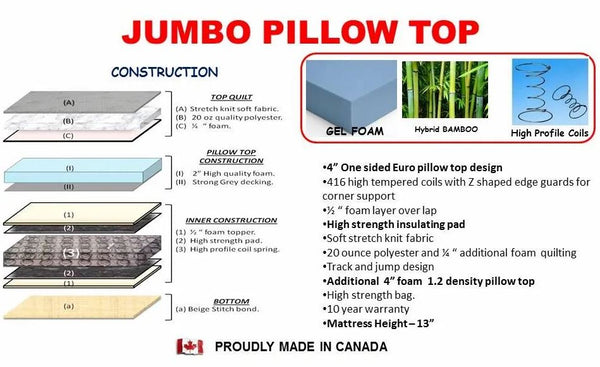 Canadian made 13" thick mattress made with high profile coils, gel foam and 4" euro pillow top. Available in Twin Size, Full Size, Queen Size, and King Size.