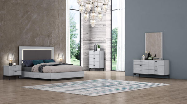 Bridge the gap between modern and unique style with this breathtaking 2 tones colour selection. Features a cool grey high gloss lacquer finish with matt black metal legs across the entire set. The headboard features a charcoal grey leather with channel designs along the middle. Available in King size only