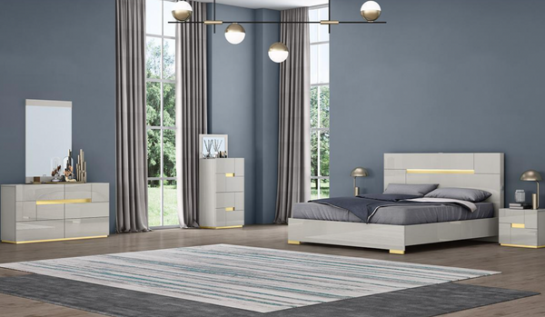 - Includes: Bed (Queen or King), 2 Night Stands, Dresser + Mirror, Chest