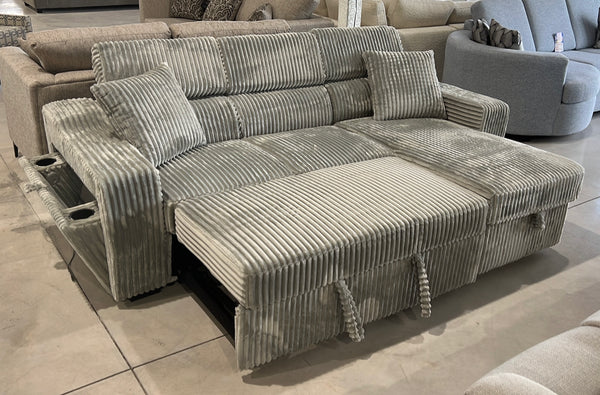 Whether seated or laying down, the design of the Luna Collection utilizes hidden storage, and convertibility to achieve a welcome spot for relaxation. The reversible configuration of the three-seat sectional creates the option of a left or right chaise placement for a perfect fit within your casual living room. The pull-out bed that is stored beneath the two-seat unit of the sofa, pops up to match length with the storage chaise creating ample space for full leg extension. The lift-top seat of the chaise opens to reveal hidden storage perfect for blankets and pillows. Plush corduroy upholstery covers the collection, available in Grey or Beige. Features adjustable headrests and arm storage with cup holders on both arms.