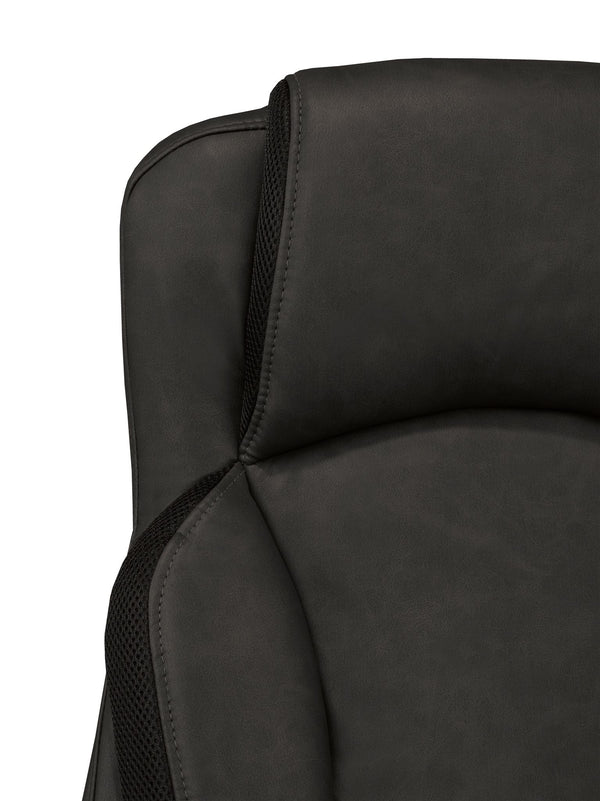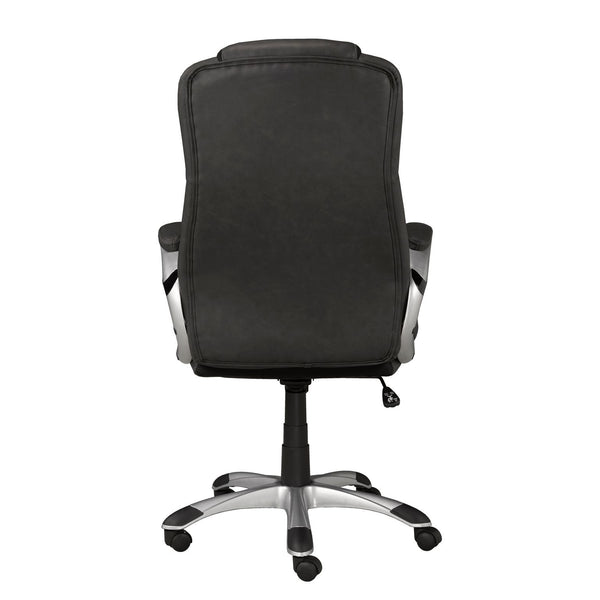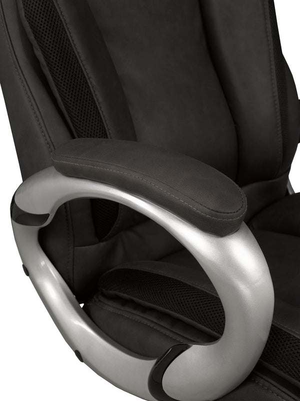 Set yourself up for success with this high-backed, ergonomic office chair. As fashionable as it is functional, this sleek chair features a convenient tilt mechanism and gas lift function to ensure proper alignment while you’re working at your desk. Lean into the full back and headrest and place your arms on the curved armrests to enjoy comfortable support as you work. The sturdy pedestal base features five wide legs for stability, each with a rolling castor for ease of movement. The rich fabric cover is finished in a neutral dark grey color that easily complements any home office décor with its clean and contemporary look.
