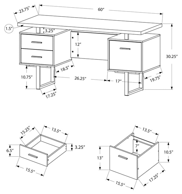 - Drawer handles, desktop supports, and sturdy U-shaped metal legs are in a contrasting silver finish